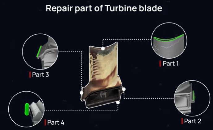 DED tehnology also facilitates the repair and refurbishment of targeted geometry, enabling: